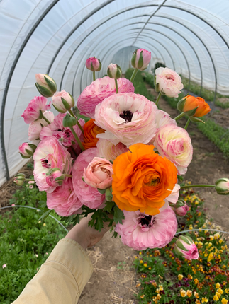 Ranunculus are sort of the queen of spring among flower farmers. They have a reputation for being difficult to grow because they require cool temperatures and will go dormant once temperatures are above 70 degrees. This means in Kansas springs, they usually only bloom for two or three weeks before the heat shuts them down, and they must be established early enough to beat that heat or they won't bloom at all. If you get this timing right, they really aren't too fussy and the extra care they require is worth it for their fabulous blooms.
